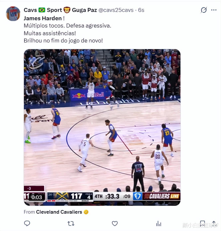 骑士媒体:詹姆斯-哈登多次封盖,多么出色的防守,他再一次在末节发光发热。