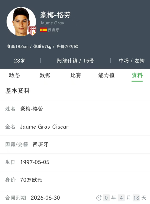 目前,28岁的西班牙籍中场【豪梅-格劳】已经与球队汇合且参与了几场训练,其今年28岁,身价70万欧,2024年从西班牙转投葡萄牙的阿维什镇队,两年出场53次首发46次,本赛季逐渐成为球队的替补人选,与阿维什镇还剩4个月的合同。其具备出色的拦截与抢断能力,但传球能力稍差。